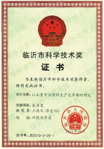 日前,集團自主開發的《以木薯干為原料生產麥芽糖的研究》項目獲2011年度臨沂市科技進步二等獎。